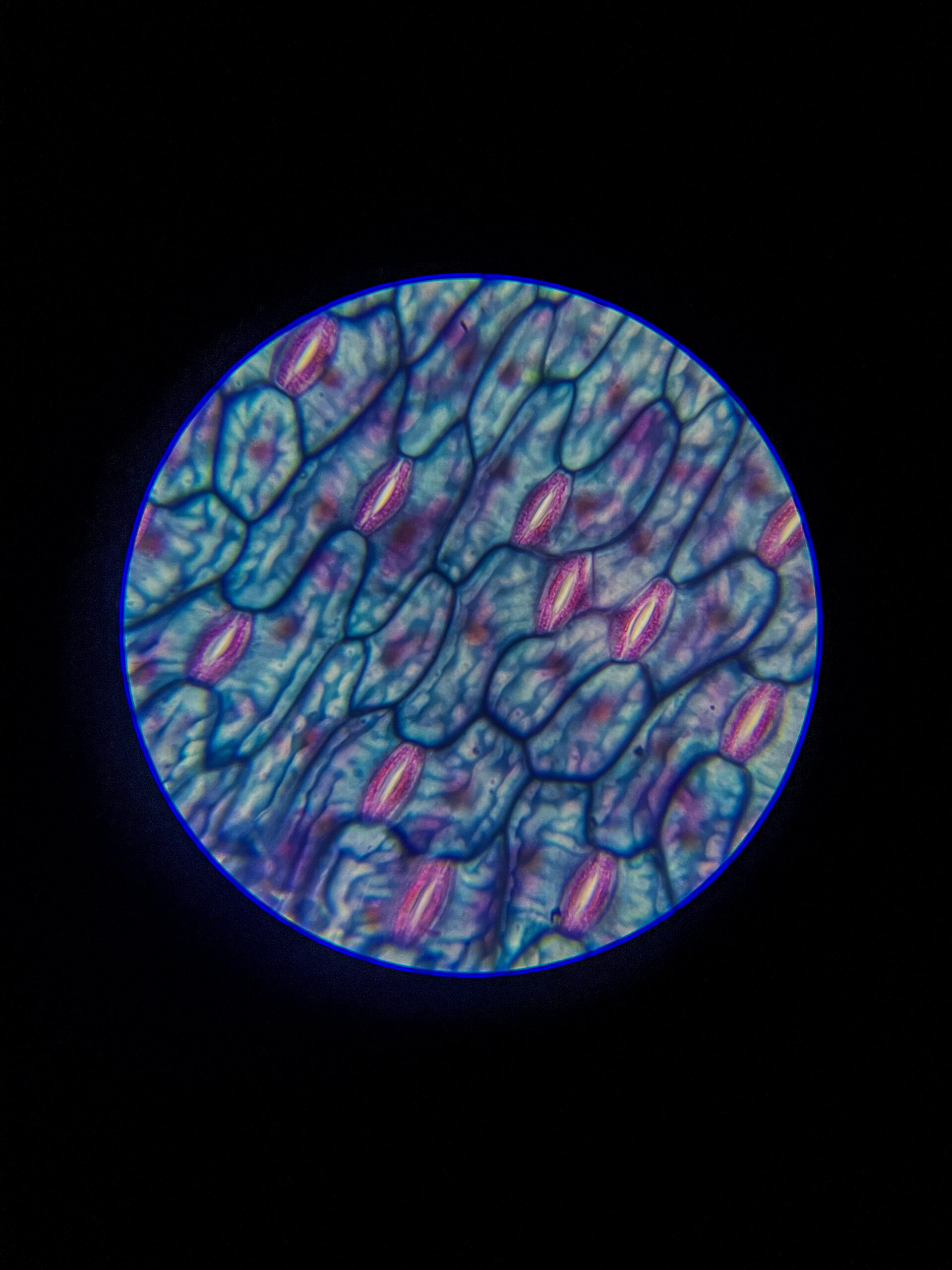 Under microscope, epidermal cells form a continuous layer with visible cell walls, and stomata appear as distinct oval or slit-shaped openings